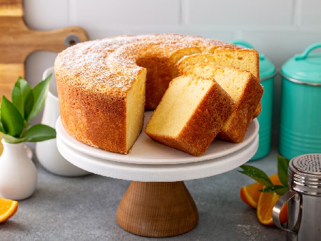 Кекс от брашно, яйца, кисело мляко и бакпулвер със сладко от портокали във форма