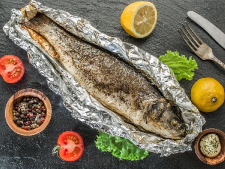 Печена риба лаврак с чесън във фолио на скара
