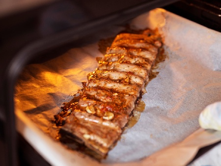 Печени свински ребра на фурна в марината от червено вино, чесън и кимион