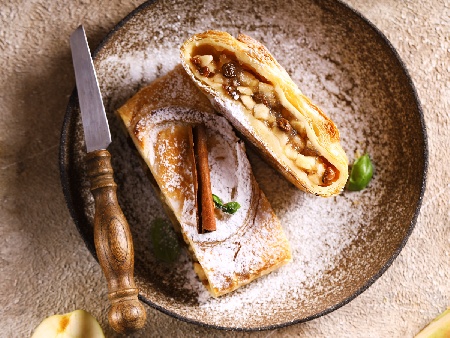 Щрудел с кори от домашно тесто, ябълки, грис, прясно мляко и канела