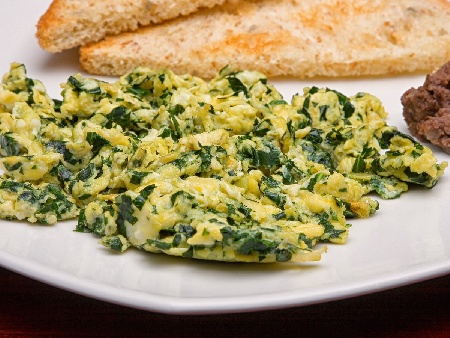 Бъркани яйца със замразен спанак и лук
