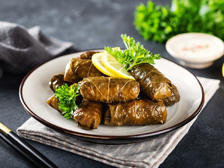 Лозови сарми с телешка кайма, лук, гъби, стафиди и орехи по родопски