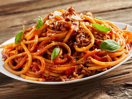 Лесни спагети със сос Болонезе с кайма, доматено пюре, червено вино, пармезан (или кашкавал), канела и босилек |