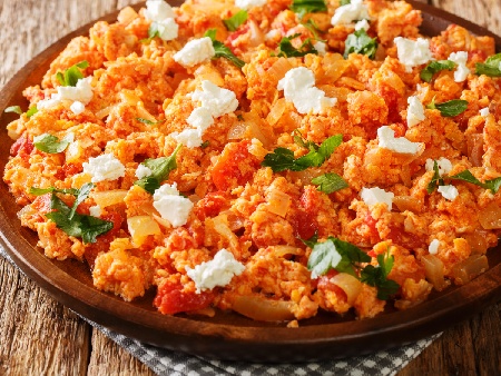 Това популярно гръцко ястие, което се нарича „strapatsada“ или „kagianas“ се състои от нарязани на кубчета, сотирани домати, които са подправени с пресни билки, след което са комбинирани с леко разбити яйца и гарнирани с натрошено сирене фета. Въпреки че традиционно се свързва с Йонийските острови, обикновено се консумира в цялата страна.