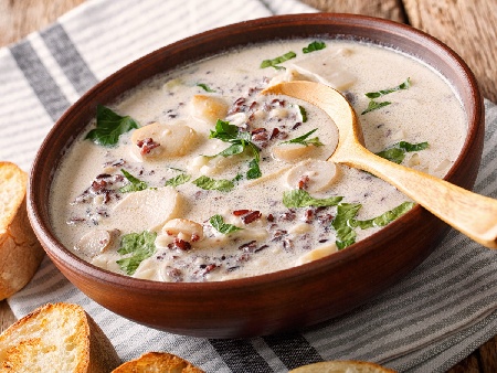 Кремообразна супа от див ориз с бекон, сметана и прясно мляко