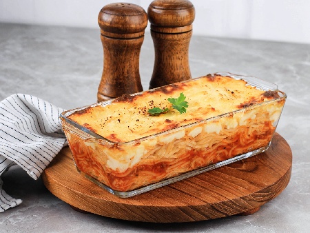 Сместа се изсипва в йенски съд за печене, поръсва се с настърган кашкавал.