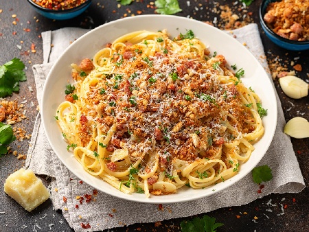 След това в тигана се слага и сварената паста и отделената около 1/4 чаша вода. Ястието се поръсва с настъргания пармезан, разбърква се добре и се подправя с черен пипер и сол на вкус.