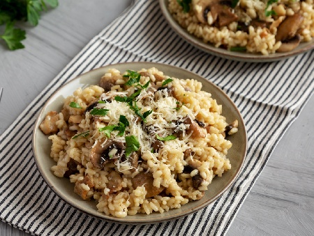 Ризотото се овкусява със сол, черен пипер и настърган пармезан. Разбърква се и се сервира, докато още топло.