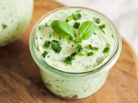 В блендер се слагат чесън, магданоз, босилек, майонезата и оцет. Смилат се, докато се комбинират.