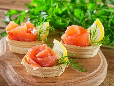 Солени тарталети с плънка от краставички, майонеза и сьомга