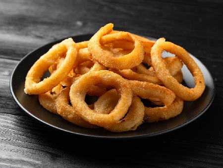 Няколко филийки лук се слагат в купата с брашното и се разбъркват, докато леко се покрият. След това се овалват в приготвеното тесто и накрая - в галета. Панираните кръгчета лук се пускат в сгорещеното олио и се запържват до златист загар от двете страни.
