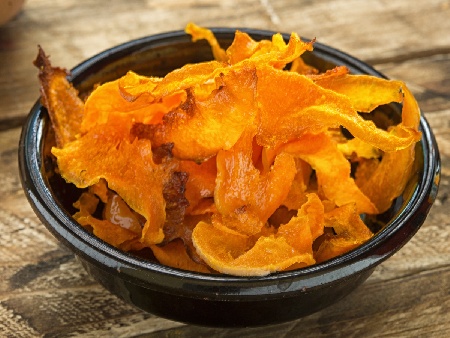 Сладкият картоф се нарязва на филийки с размери около 4-5 мм.