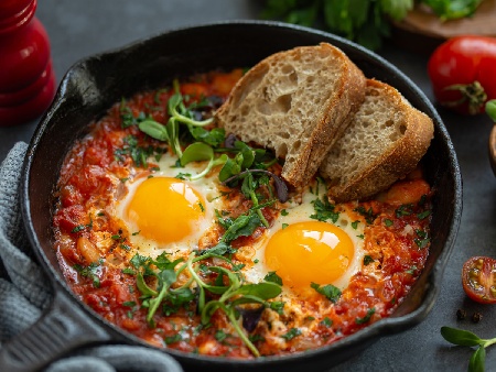 След като се свали от котлона, върху шакшуката се поръсват фетата и пресните билки. Сервира се топла с хляб или наан за потапяне.