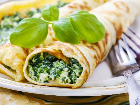 Солени средиземноморски палачинки със сирене пармезан, моцарела, извара и спанак