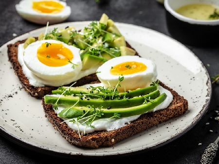 Ръжени тостове (сандвичи) с меко сирене, авокадо, твърдо сварени яйца и зехтин