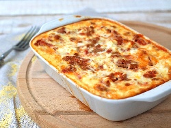 Вкусна картофена запеканка с пилешко месо, замразени зеленчуци, яйца, сирене Моцарела и сметана запечени на фурна